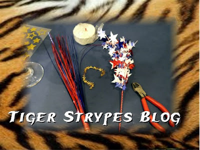 I attached the red & blue part by removing the tape to make it a larger circumference and then cut up pieces of the stars and attached them to the little gold tie piece that had been securing the paper at the bottom of that table piece. This was just wrapped around and secured by glue dots at the top of the stem.
