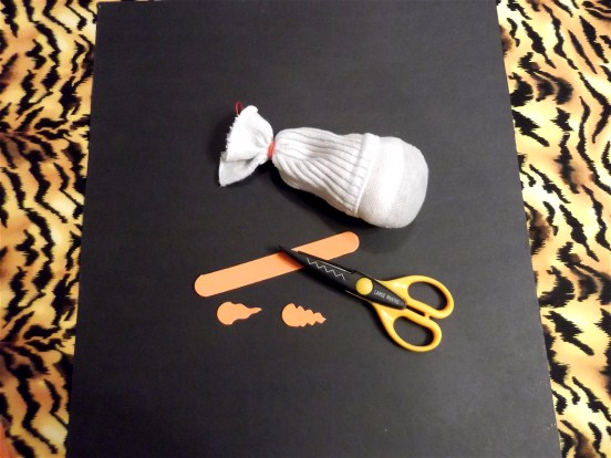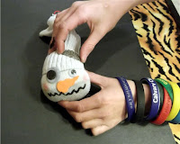 6. Glue the noses on to the sock. Using a marker, we colored the mouths on and glued on the googly eyes (Dylan said he wanted his to look different).